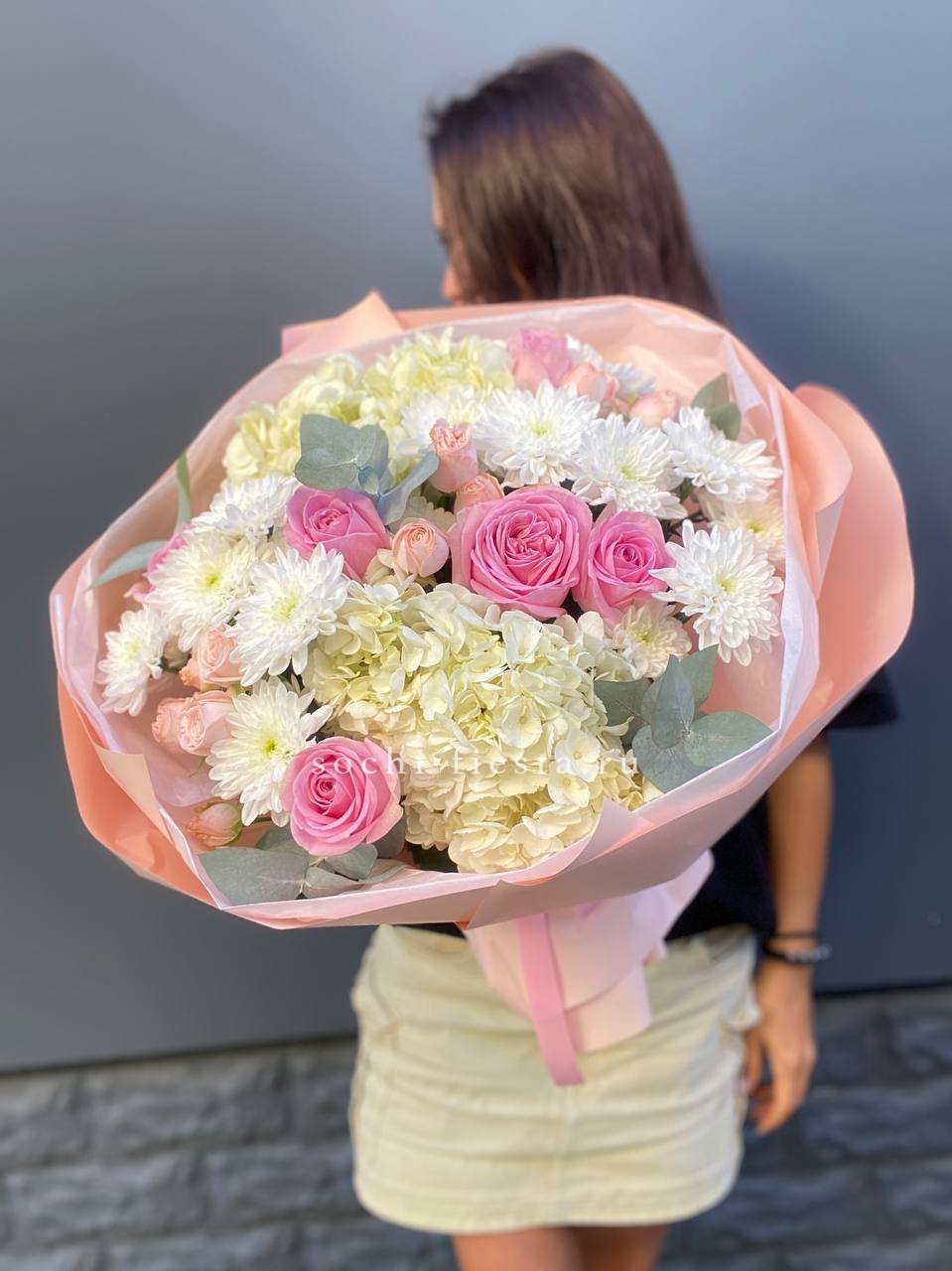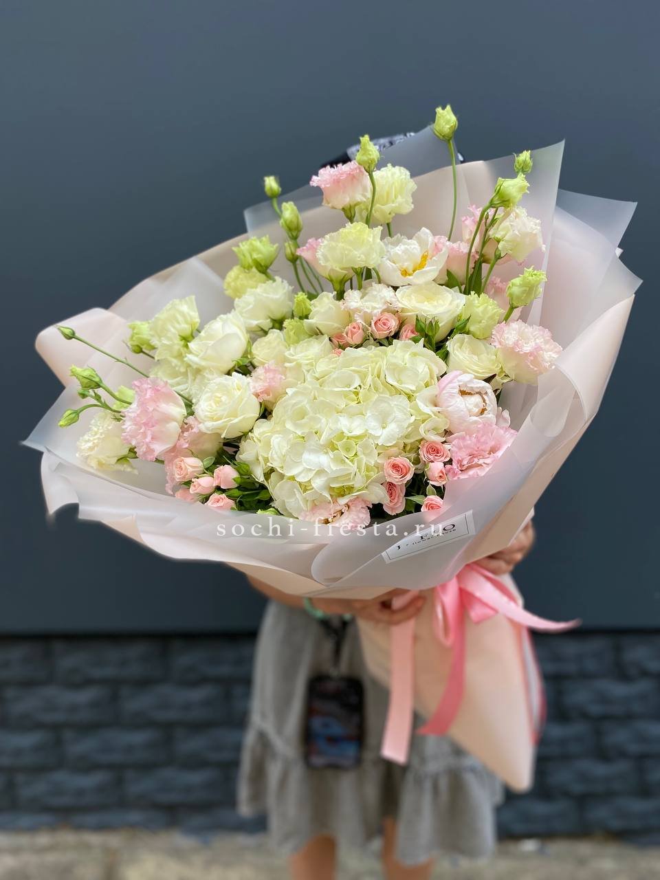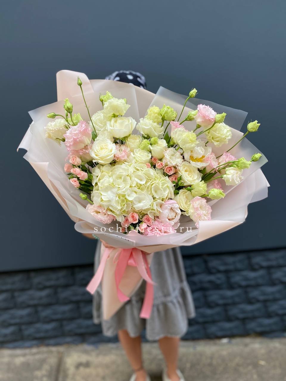 Этот пышный авторский букет напоминает нежное зефирное облако, в котором гармонично сочетаются объемные формы и изысканные оттенки. Композиция представляет собой микс из крупных соцветий гортензии и кустовых роз в пастельной гамме.