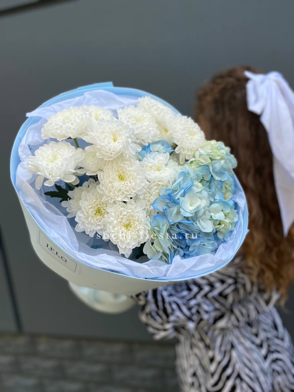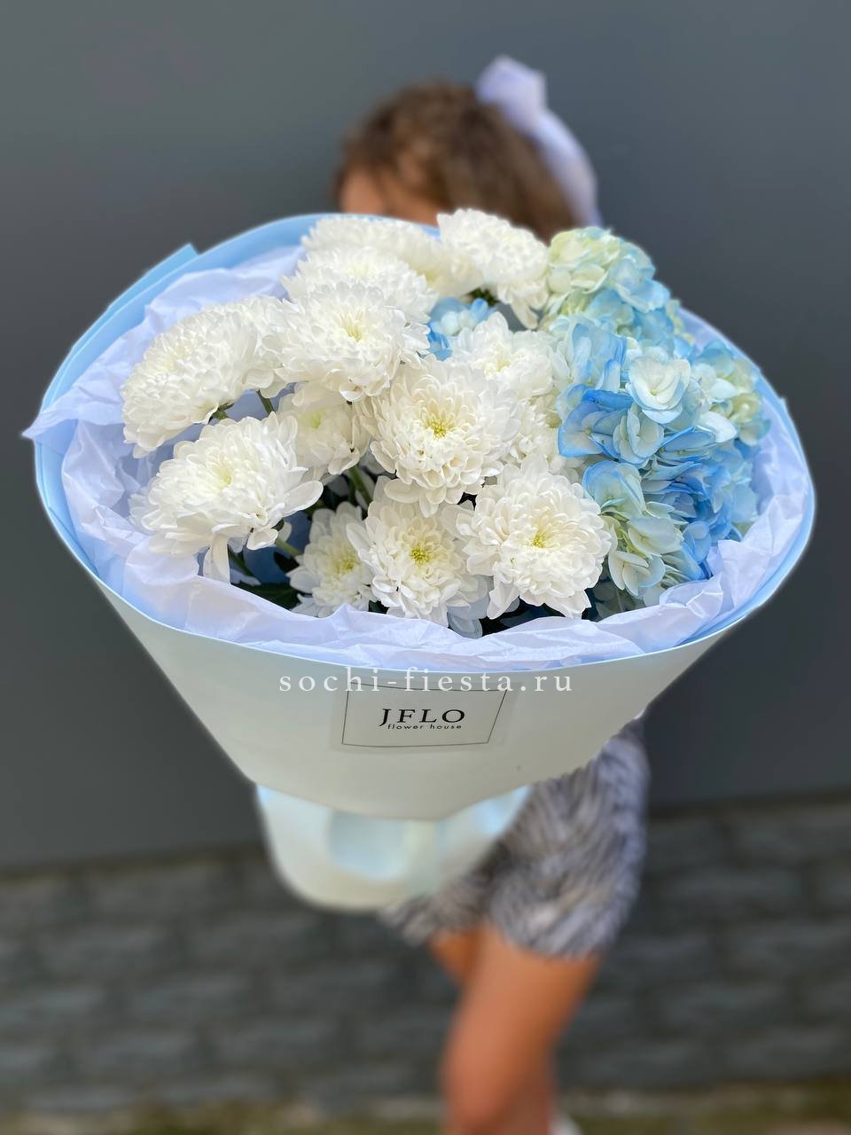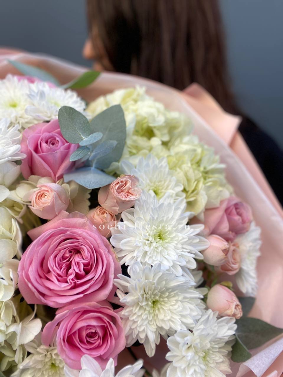 Этот пышный авторский букет напоминает нежное зефирное облако, в котором гармонично сочетаются объемные формы и изысканные оттенки. Композиция представляет собой микс из крупных соцветий гортензии и кустовых роз в пастельной гамме.