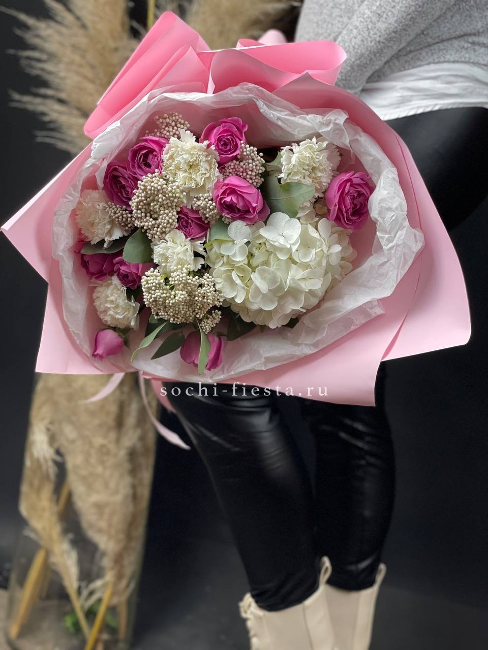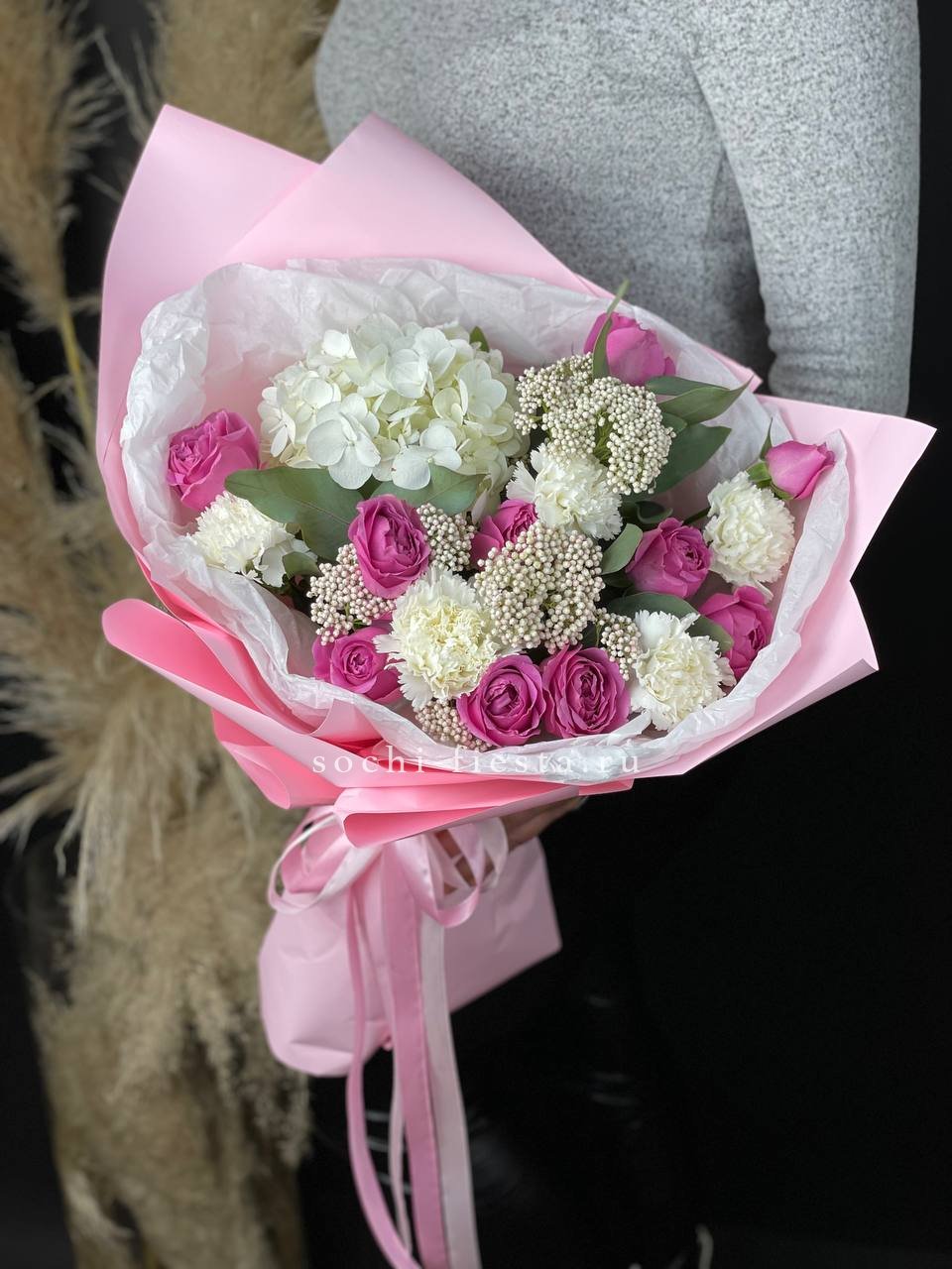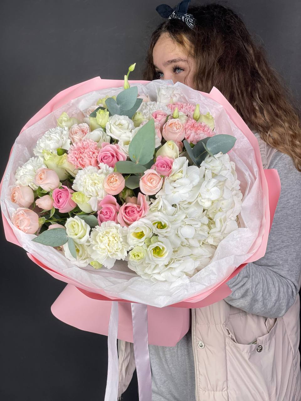 розовые розы, белые розы, диантус, бомбастик, гортензия, эвкалипт, пленка.