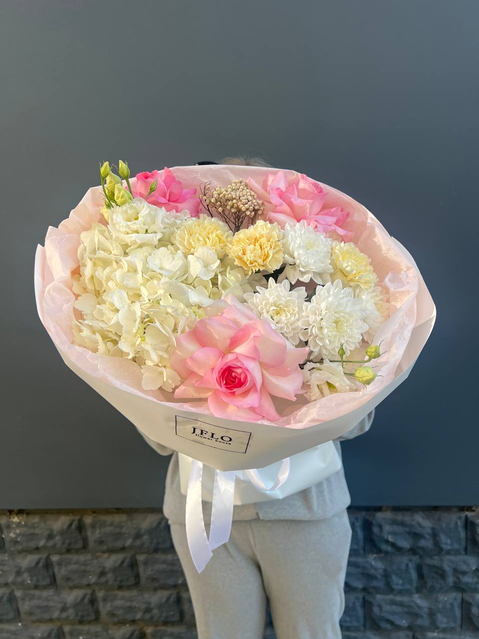 Крупные шапки гортензии окружены россыпью кустовых роз и эустомы. Композиция наполнена объемом и удерживает форму благодаря плотной сборке цветов разной высоты.