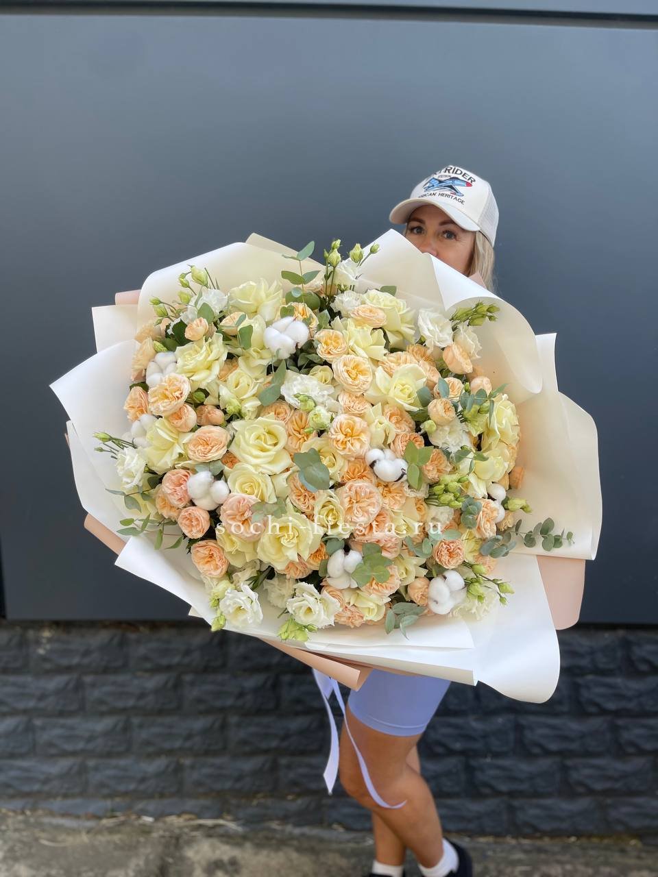 Белоснежная палитра с эустомой и пионовидными розами дополнена натуральным хлопком и эвкалиптом. Крупная композиция с выразительным присутствием и продуманной архитектурой. Форма держится долго благодаря плотности сборки.